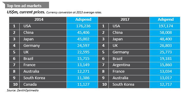 中国经济在连续多年的迅猛增长之后,开始放缓。中国与成熟市场的技术鸿沟已经缩短,使生产率增长变慢。之前以债务推动增长的时期已经过去,现面临大规模的偿付压力;大量未售卖的房产拖累了房地产市场。然而,中国的增长速度仍是大多数国家艳羡的,2014年GDP增长了7.4%,而今年政府将目标设在了7%。中国广告市场也相应放缓,但从全球水平来看,仍处于健康水平。报告预计今年中国广告支出将增长9.1%,低于过去五年10.5%的年均增长率,但却是全球平均水平的两倍以上。预计2014-2017年中国广告市场的年均增长率为8.5%。