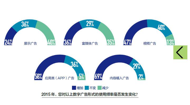 基于内容营销的广告形式越来越受到广告主的认可。数据显示,2015年,69%的广告主打算增加内容植入广告的使用频率,而展示广告和富媒体广告的使用则会大幅度减少,其中展示广告的减少将达到40%。