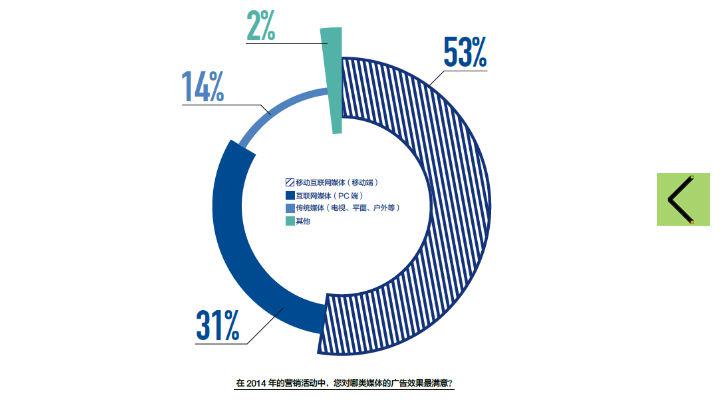 调查中近八成广告主在2015年最经常使用微信公众号等自媒体。近九成广告主表示会在2015年经常使用微信,且有50%的广告主认为微信将成为未来营销活动中的必用平台。移动媒体应用的快速发展,推动移动广告形式更新,成为广告主眼中的重要机遇。