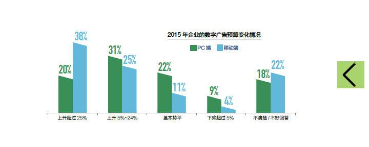 在HDMR广告主调查中,有近八成的广告主表示在2015年将积极尝试新的广告渠道和技术,较去年上升25%。另外,数据显示,2015 年广告主对移动广告的投入增长率超过PC端:近四成广告主计划将移动广告的费用提高25%以上;而PC端的数字广告费用将保持不变或小幅增长。实际上,经过两年的移动营销尝试,广告主已经逐步认可移动广告的价值并开始积极进入,移动广告的投放将进入爆发期。