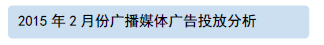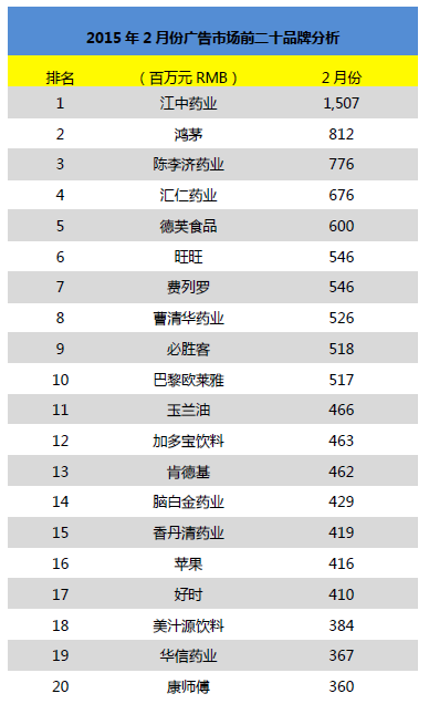 2015年2月份,广告市场前20品牌行业集聚态势明显,药品大类延续强势地位;食品、饮料大类受节庆因素影响,本月表现突出。上榜品牌的广告投放总体呈现出环比下降、同比上升的趋势,与本月广告投放市场表现相一致。江中药业以超15亿元的广告投放蝉联榜首,鸿茅、陈李济药业、汇仁药业位居其后。在本月广告投放前20品牌中,药业品牌占据8席。