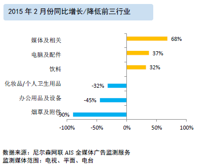 2月份,平面媒体在花费上,同比方面食品、饮料行业增幅显著,分别增长56%,35%;烟草及附件、房地产和家居用品行业降幅位列前三,分别下降55%、52%和46%。环比方面,整体行业明显走低,仅有烟草及附件和电信行业呈现增长,增幅分别为36%和9%,办公用品及设备行业降幅最大,为82%。