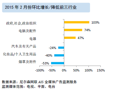 环比方面,政府,社会,政治组织、电脑及配件和电器行业以103%、74%和47%的增长一扫上月仅两个行业小幅增长局面。烟草及附件以53%的下降持续走低,化妆品/个人卫生用品和汽车及有关产品行业分别以40%和24%的降幅紧随其后。具体到行业细分,化妆品/个人卫生用品行业中占据较大比重的美发产品小类和个人卫生用品小类过半的广告投放费用流失成为主因,两个小类削减了电视媒体方面的广告投放费用,其在平面媒体上的广告投放没有明显波动。