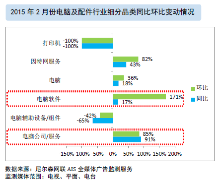 2月份,电脑及配件行业整体广告市场同比增长37%,环比下降74%。除电脑辅助设备/组件小类和打印机小类呈同比环比双下降趋势,其他各小类均有不同幅度的增长。同比方面,电脑公司/服务小类以91%的大幅增长位列第一。广告投放费用占比近整个行业八成的因特网服务小类同比增长43%,这与其子小类电子商务网站/公司/服务144%的同比增长有关。