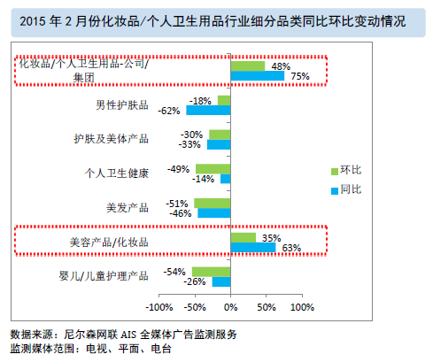 2月份,化妆品/个人卫生用品行业整体广告市场同比下降32%,环比下降40%,广告投放花费维持在全行业第四位不变。同比方面,仅化妆品/个人卫生用品-公司/集团和美容产品/化妆品分别上涨75%和63%,其他各小类均呈下降趋势,以男性护肤品62%的降幅最多。美发产品以46%的降幅、减少14亿元的广告投放费用成为同比下降的重要原因之一。