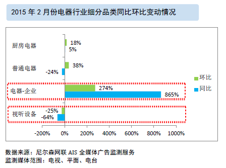 2月份,电器行业整体广告市场出现下降趋势,同比下降6%,环比增长47%。电器-企业小类以同比环比倍增的明显涨幅位列第一。具体来看,小类中的苹果品牌成为同比环比增长的主要因素,电视媒体成为苹果品牌唯一的投放选择。