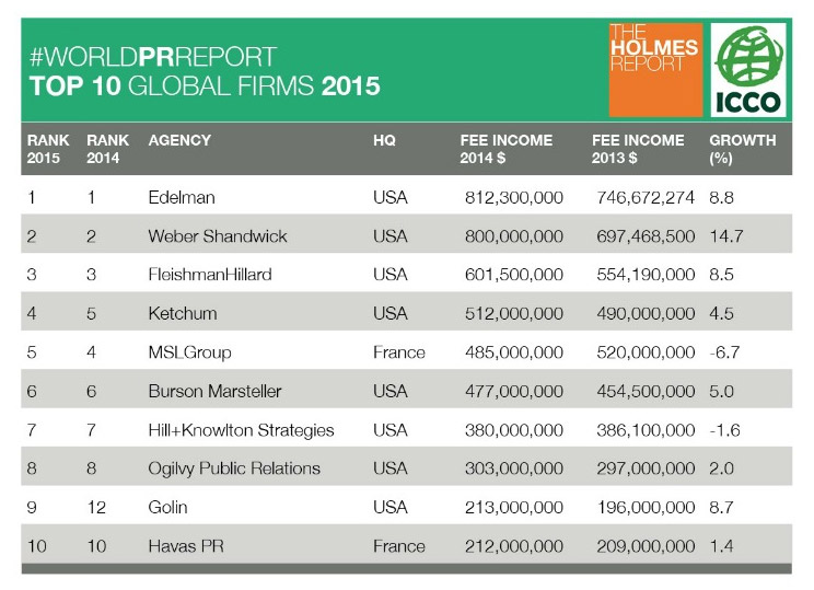 全球权威公关行业资讯机构The Holmes Report发布了2015全球公关公司排行榜Top250,排名前十的公关代理机构为:爱德曼、万博宣伟、福莱国际、凯旋公关、明思力集团、博雅公关、伟达公关、奥美公关、高诚公关、哈瓦斯公关。