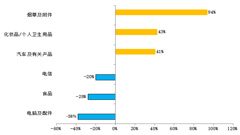 环比方面,本月各行业持续走高,增幅明显。烟草及附件以94%的增长打开行业由来已久的破冰局面,化妆品/个人卫生用品和汽车及有关产品分别增长43%和41%。除少数行业呈下降趋势,大部分行业增幅相差不大,增长局势健康稳定。电脑及配件行业爆冷降幅最大,为38%。具体到行业细分,烟草及附件大类中的吸烟用品小类在电视媒体上、烟草制品小类在报纸媒体上的广告投放成为增长主因。而电脑及配件大类中上月的亮点因特网服务小类在本月出现近三成的广告投放费用流失,或与春节期间诸多互联网巨头选择电视媒体的爆发式投放行为有关。