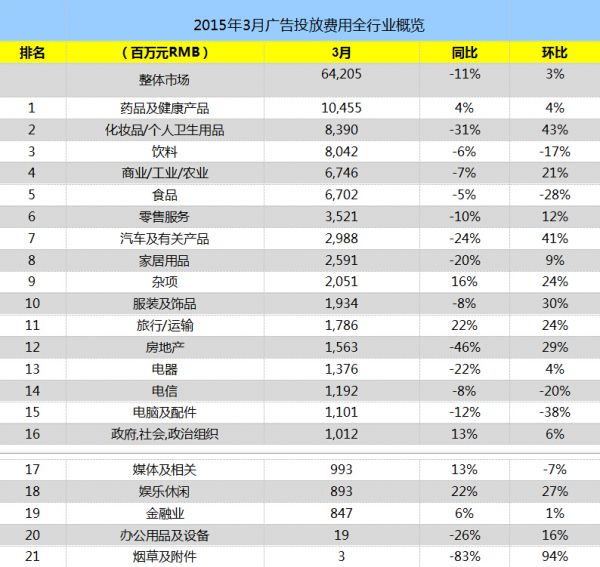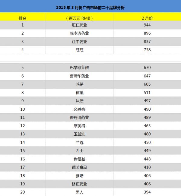 2015年3月份,广告市场前20品牌投放总额基本与2月持平,各品牌之间相差悬殊不大,优势平均。药品行业持续发力,以明显优势占领榜单前三位。与以往不同,汇仁药业虽然同比增长217%、环比增长40%成为榜单首位,但与上月首位江中药业的广告投放费用相差近60%。除此之外,陈李济药业、江中药业、曹清华药业、香丹清药业、摩美得、修正药业都有不错表现。江中药业本月一反之前蝉联榜单的好成绩,或与其减少针对江中乳酸菌素片和江中健胃消食片&儿童装的广告投放直接相关,两者减少的广告投放费用逼近7亿元。苹果在本月几乎削减了全部的广告费用,其在2015春节之际投放的新春广告曾引发不少讨论。然而随着3月的到来,苹果则再续之前大起大落的广告投放风格,无新品无新事不广告,堪称独树一帜。此外,2014年上半年曾有不错成绩的化妆品/个人卫生用品行业之后一直表现保守,本月巴黎欧莱雅环比增长30%位列第五,是行业广告投放费用最多的品牌,但仍与去年同期差距近一半。而另一品牌力士则成为榜单中环比倍增的最佳典范,近20倍的增长完全来源于其洗发/护发产品子小类中的力士3D闪耀系列产品在电视媒体上的广告投放。希望随着夏天的到来,化妆品/个人卫生用品行业的诸多品牌能够延续之前盛景,为榜单的多元化注入活力。