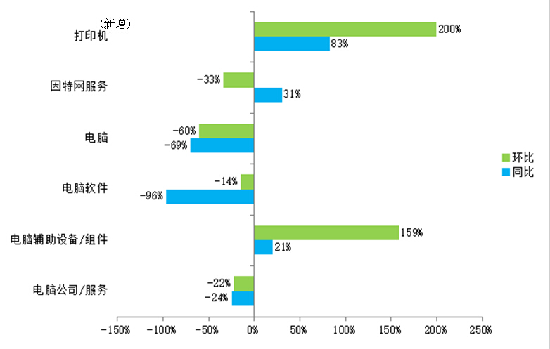 2015年3月份电脑及配件行业细分品类同比环比变动情况