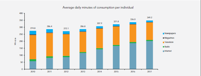 在与互联网的竞争中,受冲击最大的是报纸,其次是杂志。2010年至2014年,人们阅读报纸的平均时间减少了25.6%,阅读杂志的时间减少了19.0%,但看电视的时间仅减少了6.0%。2014年至2017年,我们预计阅读报纸的时间将每年减少4.7%,而阅读杂志和看电视的时间将分别以平均4.4%和1.6%的速度递减。值得注意的是,这些数据仅指以传统方式使用这些媒介所花费的时间——即阅读印刷出版物及在电视上观看节目。消费者在广播公司和出版商的网站上所花费的时间则计入互联网消费。