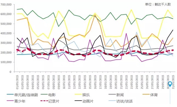 纪录片类节目触达率不高,但非常稳定:与其他许多种节目收视有明显起伏不同的是,纪录片整体非常稳定,爱看的人始终关注度很高,一直停留在这里看。