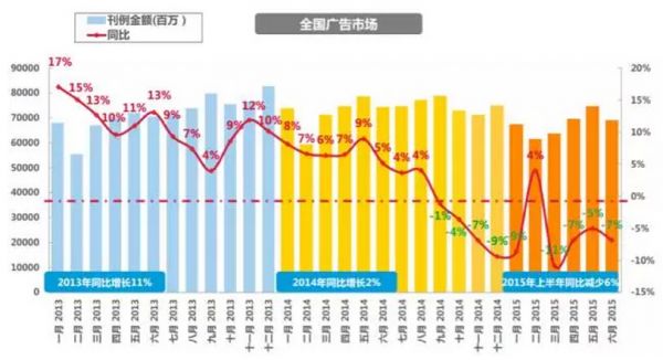2013年的广告市场总体呈增长态势,一二季度增长显著,三四季度增势减缓。2014年1-8月延续了缓慢增长的态势,9月开始广告花费相比去年不断减少。2015年上半年除2月份略有增长,直至6月仍有小幅下降。