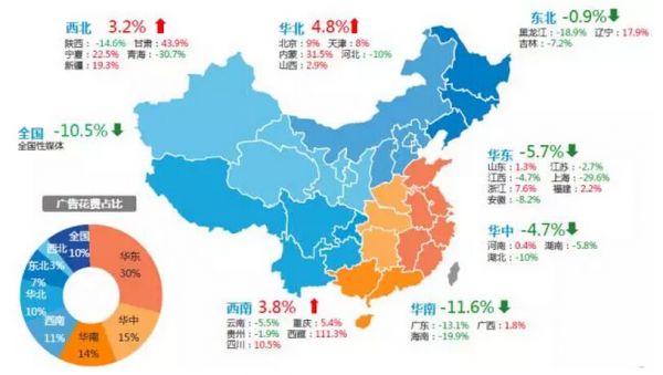 2015年上半年全国各区域广告市场刊例收益有增有减;但全国性媒体同比呈现较大幅度下降趋势,同比去年下降了10.5%。