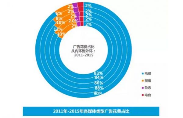 从不同的媒体类型来看,2011年—2015年(2015年为1月到6月)5年间,杂志和电台广告花费占比相对稳定,报纸广告投放花费占比小幅缩减,电视广告花费占比略有上升。可以说,电视媒体仍然占据全国广告市场的绝对领先地位。
