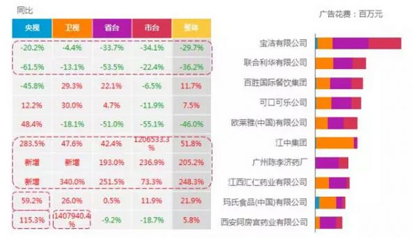 在电视媒体广告市场的大客户中,宝洁和联合利华在各级电视的投放均有同比减少;而江中集团、广州陈李济药厂和江西汇仁药业都大幅增加了在各级电视的广告投放;广告花费急剧增加的西安阿房宫药业在央视和卫视的花费增长比例都超过了100%。