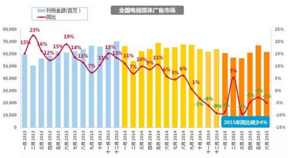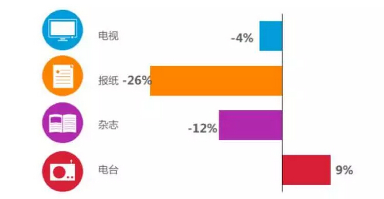 2015年上半年,电视媒体同比减少4%,电台媒体同比上升9%,平面媒体广告刊例花费仍持续呈现负增长,报纸媒体广告投放花费跌幅达到26%。