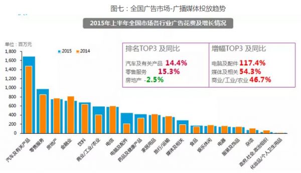 在2015年上半年的广播媒体中,汽车及有关产品行业仍保持较快增速,稳居排名第一;零售服务行业排名第二,增幅较大;金融业降幅较大,排名从第三跌至第四;同比增幅方面,电脑及配件 、媒体及相关和商业/工业/农业增长较快。
