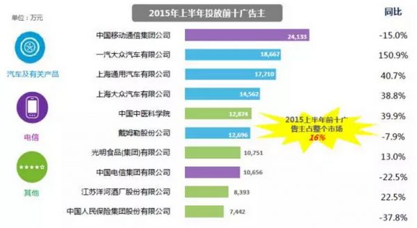 2015年上半年投放前十位的广告主中,来自汽车及有关产品行业的最多,它们中的多数涨势依然迅猛。另外,排名保持第一的中国移动下调了广告花费,属同行业的中国电信也有一定幅度的广告花费下降。