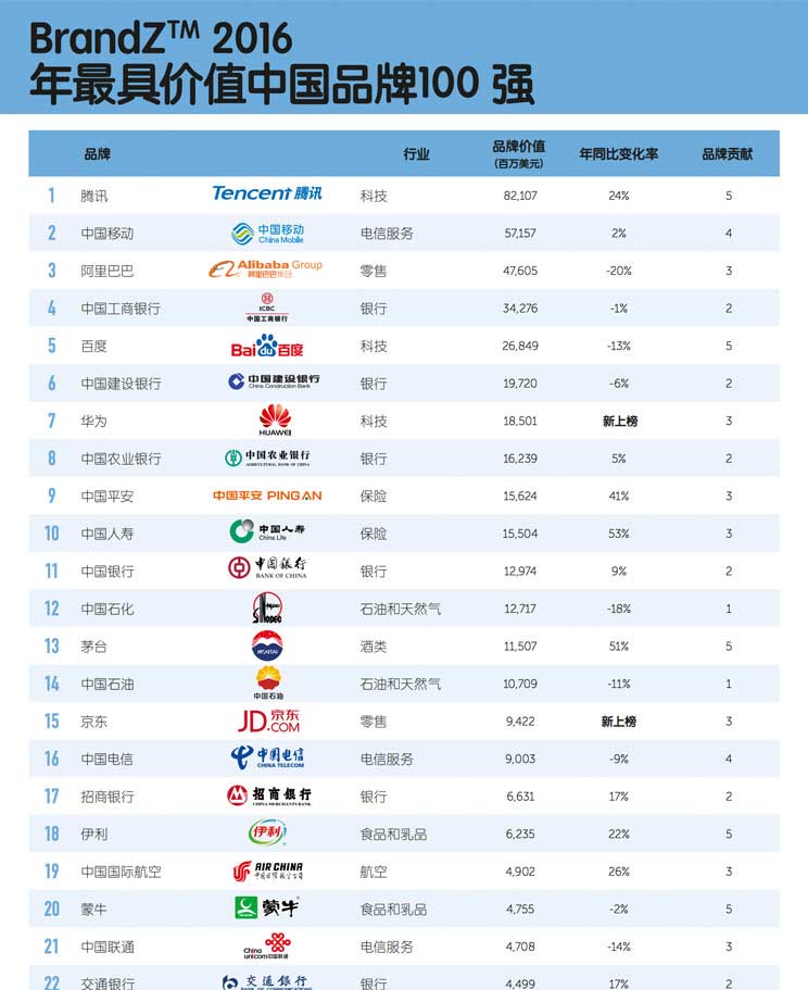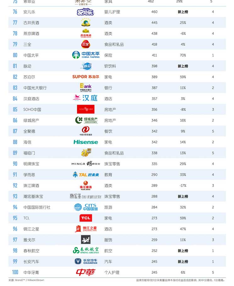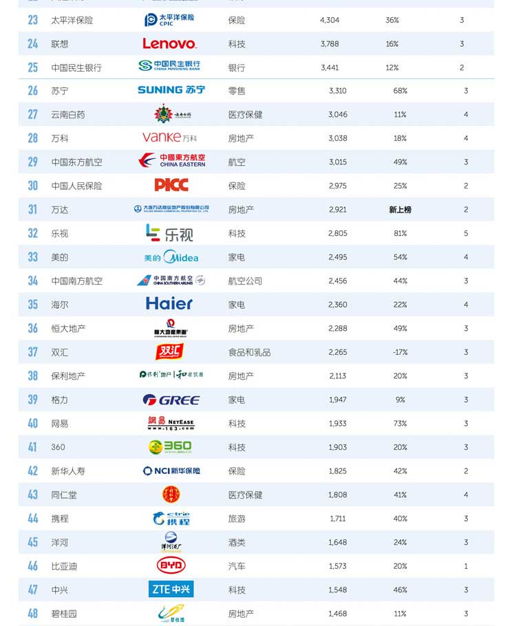 乐视(排名第 32)和网易(排名第 40)品牌价值增长最快,幅度分别为 81%和73%。这两家科技型公司都致力于打造“智能互联业务” ,利用其平台提供新产品和服务,将其更深融入人们的日常生活。