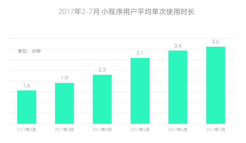 除此之外,用户在小程序内的停留时间也不断增加,从2月的1.6分钟到7月3.6分钟,小程序用户的使用习惯正逐渐养成。