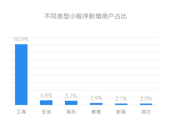 来自第三方小程序商城的数据显示,工具类小程序在数量上处于领先地位。而TalkingData移动数据研究中心的统计结果也显示,工具类小程序获得了最多的新增用户。