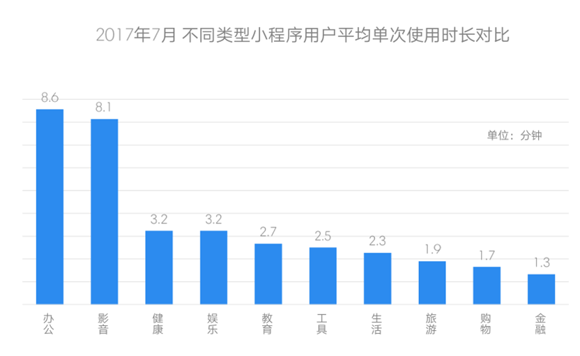 但在用户的沉浸体验与使用粘性上,办公、影音、娱乐类小程序则表现更好。数据显示,办公、影音类小程序用户目前的单次使用时长均超过了8分钟,显著高于第二梯队中的健康、教育、娱乐、工具类小程序。