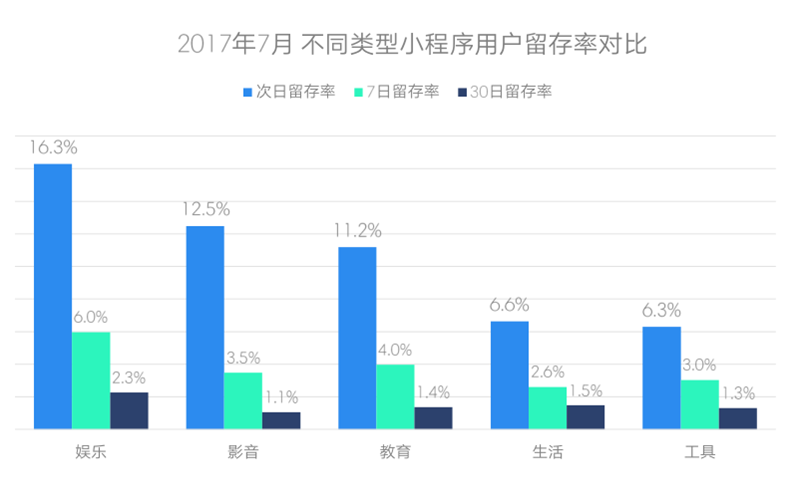 在留存率指标上,娱乐类小程序成绩抢眼。其次日留存率达到了16.3%,名列榜首,在7日留存与30日留存的表现也高于其他类型小程序。在娱乐类小程序之外,影音、教育类小程序也表现良好,均实现了超过10%的次日留存率。