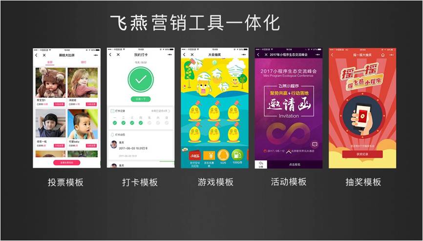 根据目前小程序移动互联网新生态的发展趋势,飞燕针对三大应用场景推出解决方案,包括垂直行业解决方案、电商、公众号营销工具。其中,飞燕公众号营销工具的功能包括用户导流、内容变现、CRM数据管理、粉丝唤醒等功能,在很大程度上实现营销工具一体化。功能包括投票、打卡、活动、抽奖等。后续飞燕还将根据公众号运营需求提供更多、更好地功能和服务。
