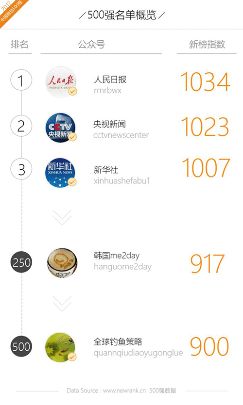 收获2017年度500强冠亚军的依旧为“人民日报”与“央视新闻”,而季军由新晋入榜的 “新华社”取代“央视财经”;“韩国me2day”(新榜指数:917)居于中位,“全球钓鱼策略”成为本年500强“门槛” (新榜指数:900)。