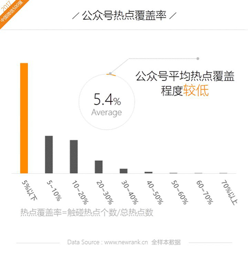 关注热点、追逐热点是新媒体人的天性,对上述热点进行整理提炼,剔除每年固定节日热点,共计整理出83个含时政、财经、科技、社会在内的全民热点。对2017年全年活跃样本的推文内容进行热点分析发现,大多数公众号对热点事件的关注范围较为有限,仅有不足70%的公众号追逐过热点。而针对那些有追逐记录的公众号,平均的热点覆盖率(触碰热点的个数除以总热点数)为5.4%,约为4.5个热点。