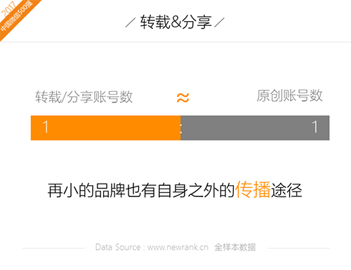 新榜对全年转载及分享模式内容进行统计,发现原创账号与被微信标记转载或分享的账号占比约为1:1,也即所有原创账号都可以获得二次传播,再小的品牌也可以有自身之外的传播途径了。