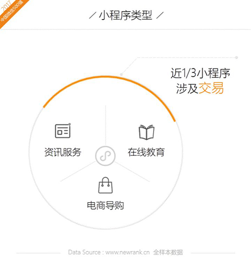 新榜从全样本推文中累计记录了6257个小程序,其中涉及交易的小程序约占总数的1/3,成为公众号名副其实的变现渠道。上述推文中的小程序以线下资讯服务类(多同城服务)、在线教育类及电商导购类居多。