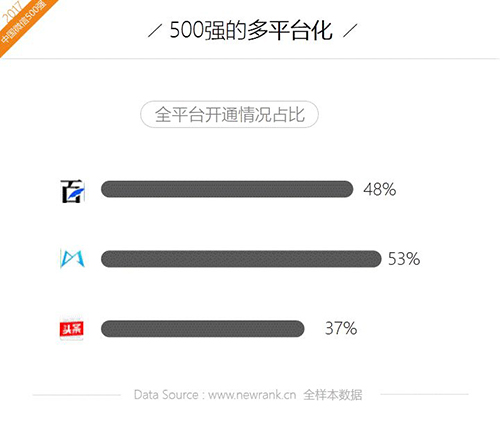 7. 全平台化趋势明显,500强公众号在今日头条、百家号和企鹅号的开通率平均为46%,接近半数。