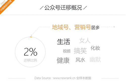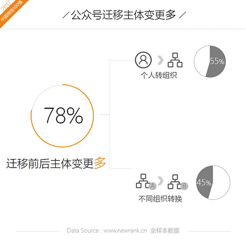 自公众号迁移功能上线以来,新榜累计监测到7903次迁移记录。全样本的迁移比例约为2.2%,假使仅在17年进入过月榜500强的账号群体中统计,这一比例将上升至6.6%。由此可见,大号的公众号迁移需求更强。