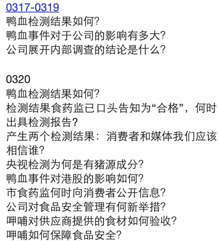 所以这 个故事也得到了印证,在报道的前两天,3 月 15 日、16 日核心信息 大家都会看到,媒体关注的核心点都是鸭血是不是真的,供应商是谁 的,都对你有罪推定了。16 日的报道,你受到了查处了吗、责任人 是谁?你们是否要做一些正面报道,提供一些费用就可以。也有这样的一些敲诈电话进来。