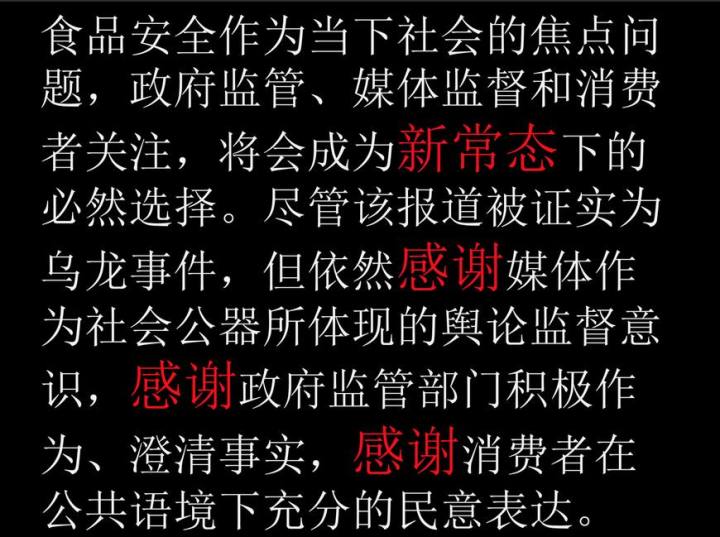 我们发布了一个声明,食品安全肯定是一个 新常态,我们要感谢媒体作为社会公信体现的舆论意识。