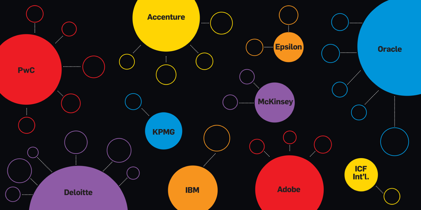 据说,在过去一年营销圈发生的398 起收购并购案中,仅有不足四分之一来自于广告控股集团。在美国《广告时代》杂志(Ad Age)发布的《2017营销服务提供商报告》中,埃森哲互动数字营销服务被评为全球规模最大的数字营销服务提供商,这是其连续第二年位列榜首。