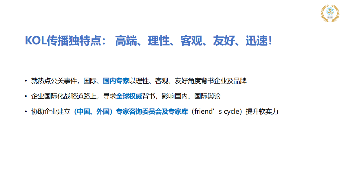 企业危机发生后,信息纷繁复杂,民众更需要听到有说服力公信力研判解读。通过专业领域KOL找到适合议题,对民众舆论进行理性引导,能够迅速消减危机对企业造成的影响。从垂直领域入手,用权威的声音为企业背书,进而扩大传播范围引导舆论正向传播,扭转舆情对于品牌的负面影响。多数企业宣传只是小圈层自嗨,缺少国际顶尖KOL背书,缺乏公信力。通过专业KOL发声、国际媒体传播增强,将观点做海内外双向露出,对有出海需求的品牌也是非常有利的。