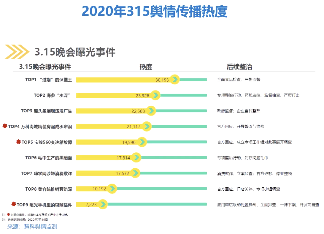 2020年315舆情传播热度,涉及食品安全、广告合规、房屋质量、出行安全、黑心商家、消费欺诈等,都是民生普遍关注问题,衣食住行。