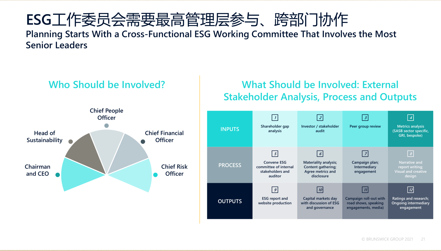 ESG正在成为企业对外沟通的世界通用语言,把ESG风险管理纳入商业战略迫切而紧急。净零排放目标将推动各国新政策出台,贸易全球化和移动互联网把世界连接在一起,但同时重大风险也在全球层面上同步。好的ESG实践总是始于企业愿景、使命、价值观,以此建立可持续发展和ESG战略的基石。ESG工作委员会需要最高管理层的参与、跨部门协作;建立ESG生态系统;ESG不能止于发报告,策略传播与利益相关者沟通至关重要。
