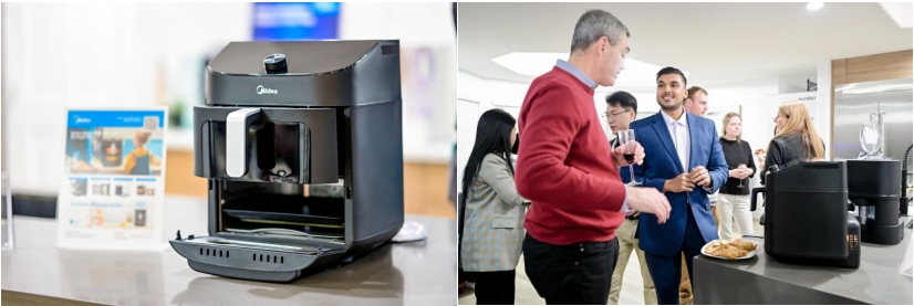 Midea在本次活动中推出的产品是一款11夸脱的双区域空气炸锅烤箱。这款产品由一个6夸脱的空气炸篮和一个5夸脱的传统烤箱组成,可以一次“同步完成”烹饪两款菜肴。它采用先进的360°快速空气热流,确保快速均匀烹饪。此外,这款产品还配备Wi-Fi,可通过SmartHome应用远程控制,并且还可以与智能家居系统如Alexa和Google Assistant兼容,实现语音控制。这款先进的产品有10种烹饪功能,包括空气炸、烧烤、烘焙和脱水,提供多种烹饪选项以满足不同口味和饮食偏好,旨在满足现代家庭不断发展的需求,同时也证明了Midea致力于革新厨房技术的决心。