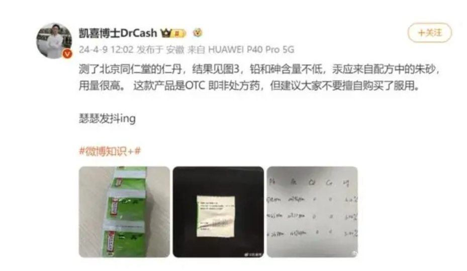 当天,微博视频博主“凯喜博士DrCash”也发文称,在国内检测另一批次的北京同仁堂仁丹产品,发现汞含量不低。