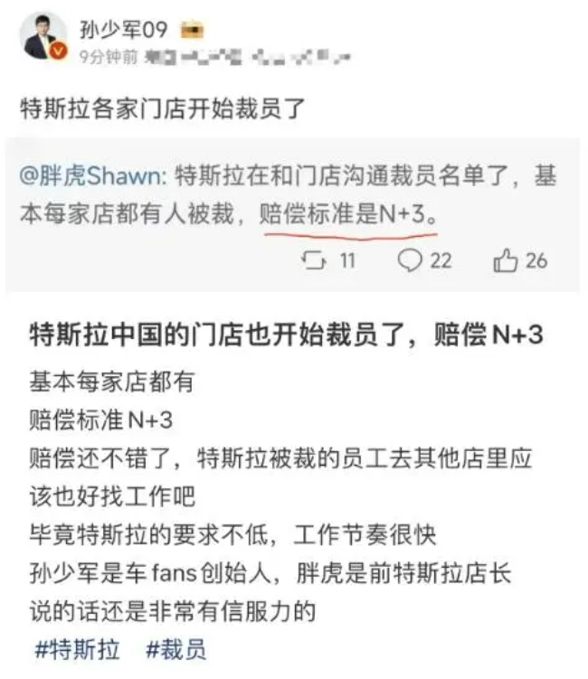 由于销售不及预期,马斯克宣布特斯拉全球裁员10%,影响约1.5万名员工,但特斯拉中国裁员比例远不止马斯克说的10%,销售部门是裁员重灾区,有的部门将优化 30%~40%,赔偿金额均为“N+3”(工作年限+3个月工资),比美国员工“更丰厚”。