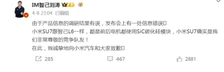 这一说法很快遭到了小米汽车产品经理潘晓雯的质疑,称“小米SU7全系全域碳化硅“。当晚,智己汽车CEO刘涛针对参数错标“以个人名义”向小米汽车致歉。