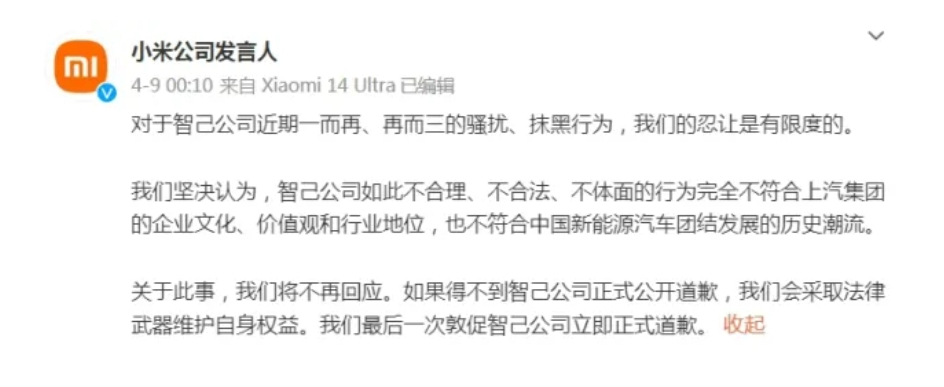 显然,小米汽车没有接受“个人名义”的致歉——当晚至9日凌晨,小米公司发言人官微就“智己L6发布会错误标注小米SU7 Max关键参数”一事,连发三文要求智己公司正式公开道歉,否则将法律维权。