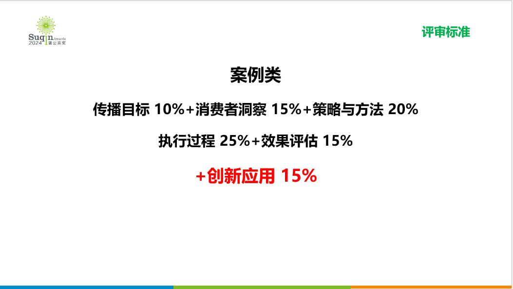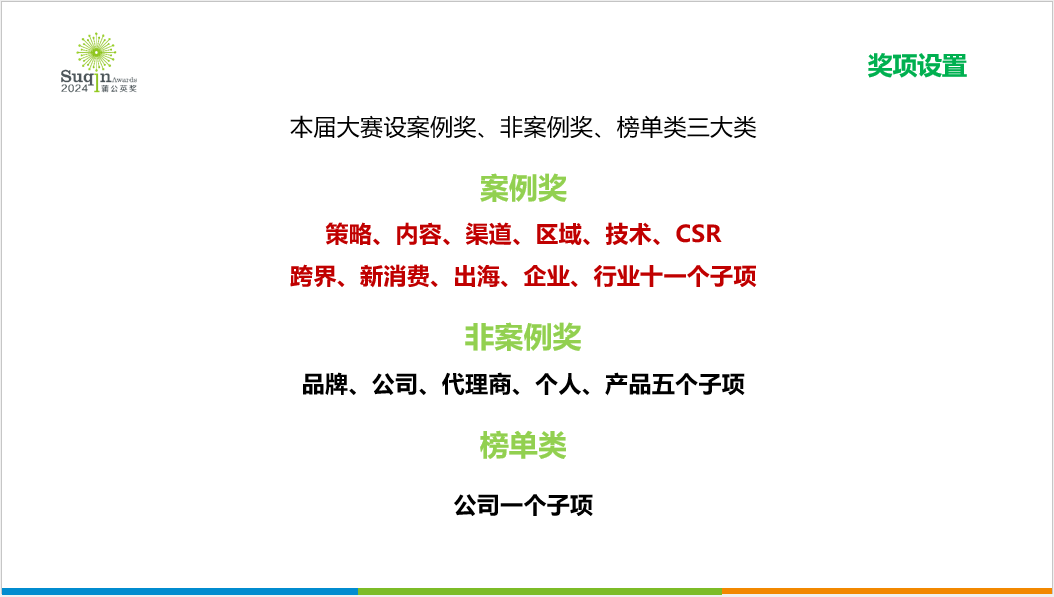 按惯例,每年赛事组委会根据市场的变化,对奖项类别进行微调,以确保甄选作品反映主流情况和最新发展。今年案例类别新增了汽车组别,更多鼓励汽车行业的创新发展,同时增加了音频营销、AIGC营销、微博营销、微信营销、抖音营销、小红书营销、视频号营销、活动管理、内容营销、数字营销、精准营销、搜索营销、海外声誉等奖项,非案例类增加了年度增长品牌、年度国潮品牌、年度出海品牌、年度增长公司、年度出海公司、年度ESG公司、年度影响力代理商、年度增长代理商、年度创新代理商、年度出海代理商、年度ESG代理商、年度品牌人物、年度AIGC工具等奖项。