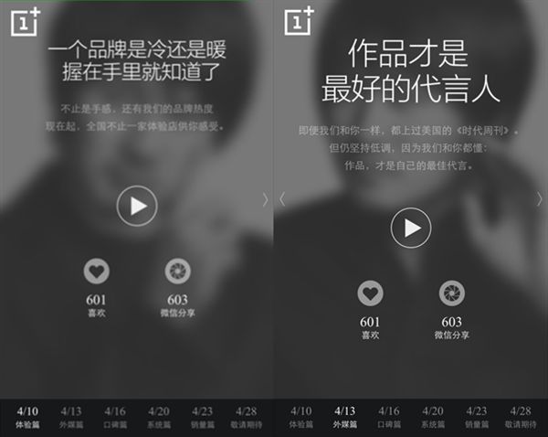 一加手机一直认为,自己的知名度弱,是因为太低调,这有点像是魅族之于小米,此前魅族曾说,自己是输在了“猪一样的营销”。这次一加选择韩寒,除了看重韩寒在社交媒体的影响力外,还有一点不可忽略的,是“说话靠谱”,所以文案也尽量往靠谱,讲事实的路数上走。而在移动端,一加还同时推出了H5页面,据悉也是出自H5热店W之手,W此前帮助《一步之遥》,大众点评等推出过一些受到好评的作品。根据H5提供的信息来看,除了上述已经推出的5支广告片,后续还应该会有更多动作跟上。