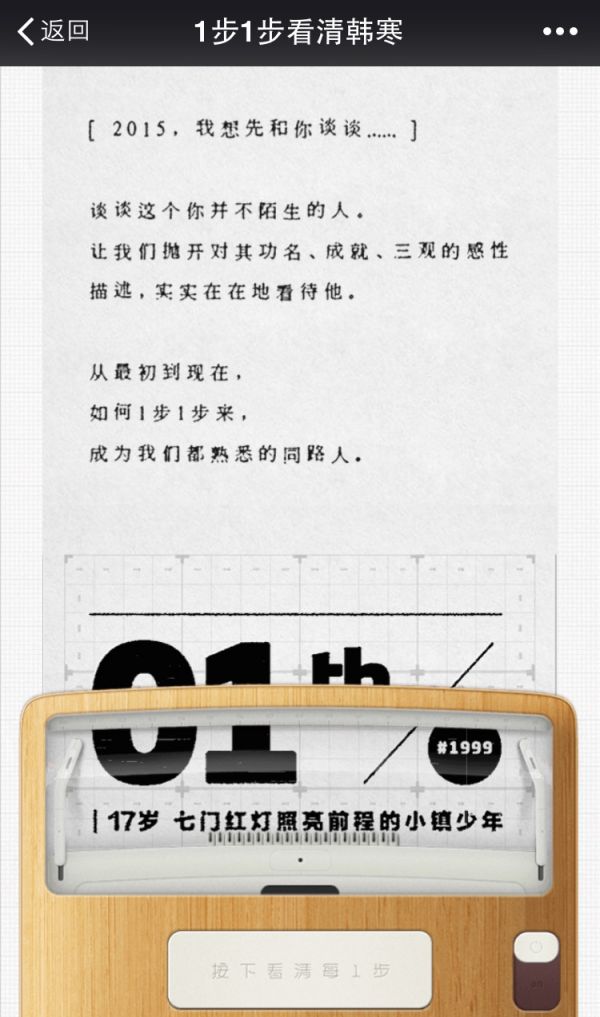 既然是“对谈”系列,这次创意团队除了让韩寒来评价一加手机,还推出了另一个主题的H5页面“1步1步看清韩寒”,整个H5页面用打字机的形式呈现,随着用户按下按钮,纸片会逐渐显示出韩寒从1999年起,为人熟知或不知的成长轨迹。