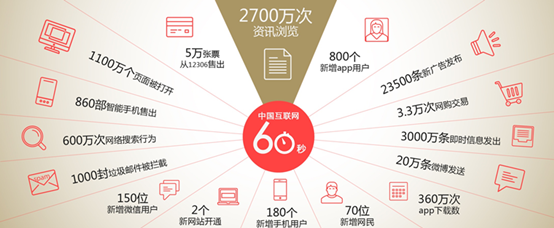 “人+信息”的关系被重构:信息获取越是便捷,生活越是缺乏深度思考。3000万条即时信息发出、1100万个页面被打开、600万次网络搜索行为、360万次APP下载数、23500条新广告发布、3.3万次网购交易……如此庞大数据,仅仅发生在中国互联网60秒的时间里。请问,你的“大脑”消化的了吗?咱还是先静静吧!